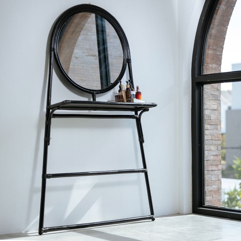 This unique standing mirror is the perfect addition to any space. Black finished rattan supports a round mirror and features a rung perfect for holding blankets, towels, or scarfs. This piece is ideal for bedrooms, bathrooms, and entryways.