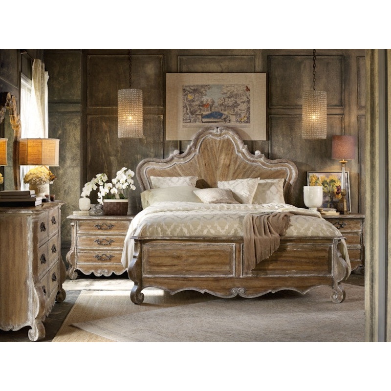 Stunning with its sweeping shaped headboard, scalloped base and turned legs, the Chatelet Panel king-sized bed exudes romance and vintage charm. The Caramel Froth finish over Pecky Pecan Veneers with a touch of aged white to highlight distinctive grains and moldings gives an aura of rustic luxury. Includes headboard, footboard and rails. Headboard can be used alone. Come home to your little castle. Relax in a livable luxury with Chatelet, a whole home collection inspired by timeless farm style antiques found in ”little castles” of Old World Europe.