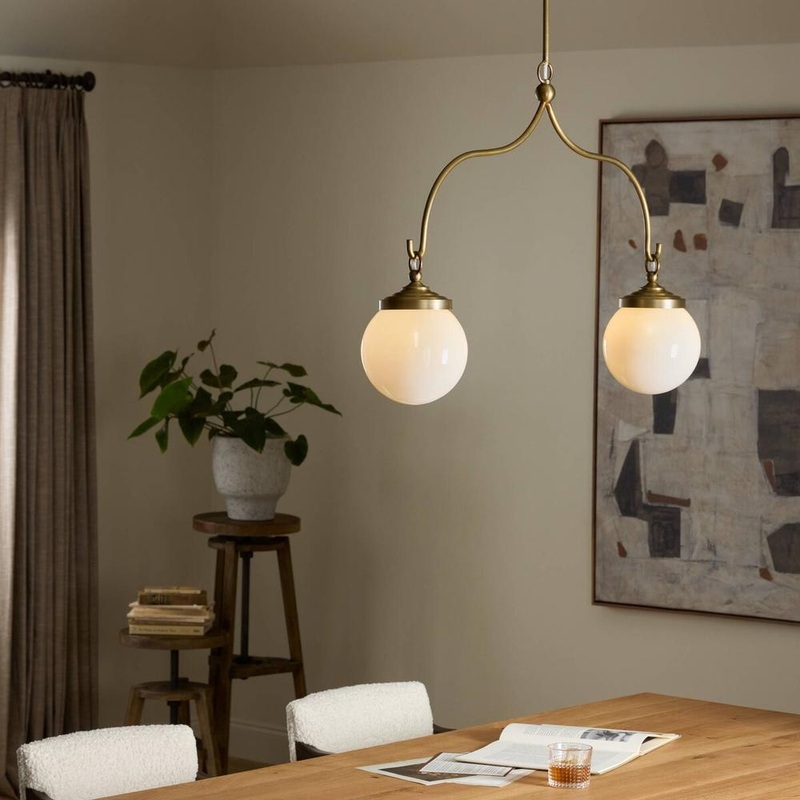 A chandelier inspired by Art Deco, featuring a pair of glass globes suspended from graciously curved iron arms finished in aged brass.