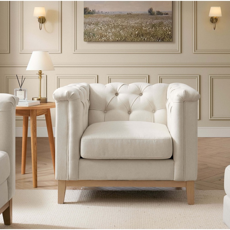 Curl up and get cosy with the linen look Chesterfield armchair in cream-the epitome of irresistible charm.