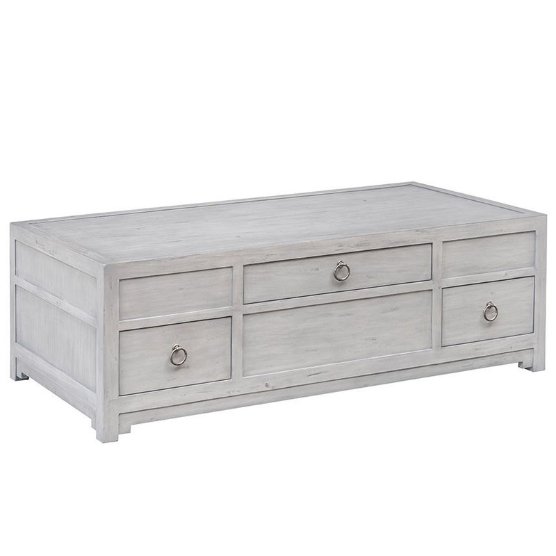 Complementing the Chesterfield Console is this casual rectangular framed chest style cocktail table. Each side has three working drawers that are opposed to each other in placement providing great depth. All acacia wood in a pale grey finish with pewter drawer pulls.
