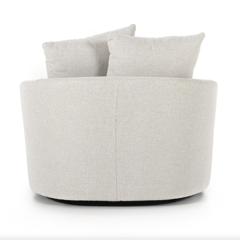 Neutral performance fabric covers a dramatic U shape for a sink-in sit. Throw pillows add a touch of comfort to this 360-degree swivel chair. Performance fabrics are specially created to withstand spills, stains, high traffic and wear, ensuring long-term comfort and unmatched durability.