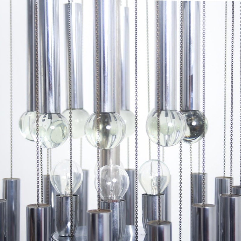 Featuring three tiers of chrome cylinders and glass balls, this chandelier is a true statement piece that combines form and function in a unique and elegant way. The glass balls add a touch of luxury and opulence, while the chrome cylinders provide a sense of structure and modernity.