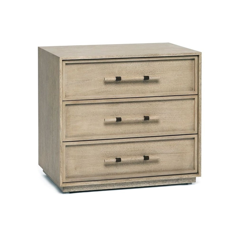Crafted of mahogany in a washed taupe finish and featuring faux horn and brushed brass metal hardware, the Clement Small Bedside Chest showcases integrity and artisanal vibes.