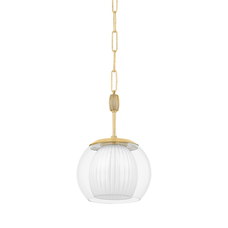 Inspired by nature, the retro silhouette of Clementon features a single orb accented by graceful details. The exterior shade is molded from clear glass, while the opal shiny glass interior features elegant fluting. Finished in Aged Brass, Clementon can make a fresh statement alone or be grouped above a countertop.