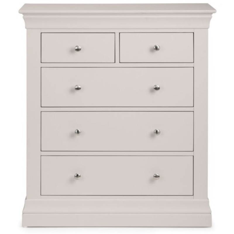 The Clermont Bedroom Collection is finished in a striking light grey lacquered finish, with simple clear lines that add a feeling of light and space. Crafted from Pine and MDF, featuring brushed steel handles, this elegant French inspired design is suitable for both contemporary and traditional settings. The Clermont 3+2 Drawer Chest offers a mixture of small and large drawers, suitable for your T-shirts, underwear and other items.
