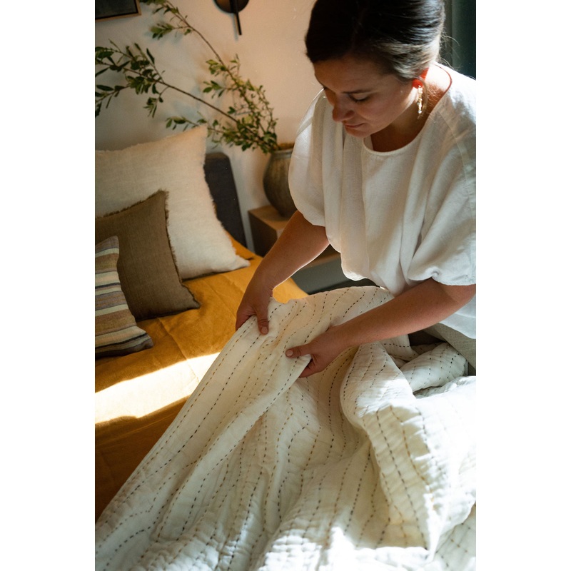 The Cloud Kantha Bed Quilt is a true testament to the beauty of hand work and cultured craft. Wavy lines of earthen coloured hand kantha stitching are a twist on the traditional straight lined running stitch we usually expect. The result is an extremely soft quilted texture with a comfortable and carefree feel. Designed for easy living, they add warmth to the bed when paired with an Indaba duvet set. Spot Clean Only.