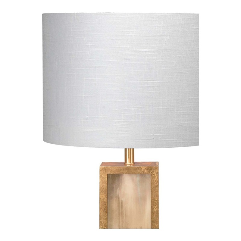Inspired by watercolor paintings of land and sky, the Cloudscape Table Lamp embraces the subtle shades of a washed picturesque view of the horizon. This piece is framed with a gold leaf border and topped with a white linen lamp shade to complete the work of art.