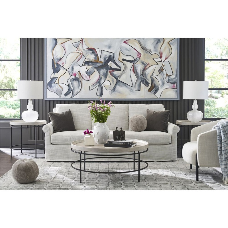Anchoring any room it graces, the Coalesce Cocktail Table is a focal point of craftsmanship in a Rolling Fog finish, adorned with tasteful metal accents. Its robust presence centers the interior aesthetic with a seamless blend of form and function.
