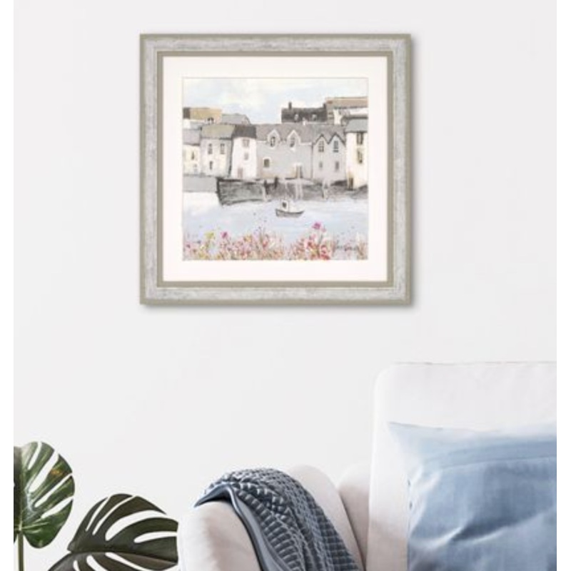 Through the wild grass, sea-thrift and daisies and sea-thrift, the white and grey-washed cottages stand quiet as a lone fishing boat sets sail in Adelene Fletcher’s quirky harbourside scene.