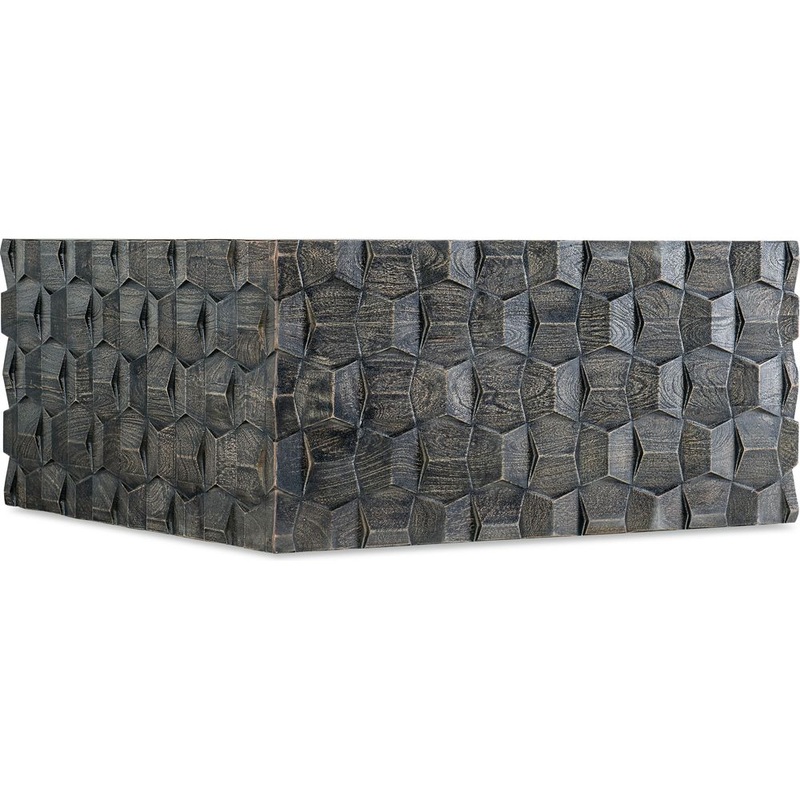 Description: Tactile and touch-worthy, the intriguing Chiseling Cocktail Table has a chiseled carved motif on the exterior. Crafted of Mango Solids, it has a transparent black wood finish to reveal color and grain variances. The 38 x 38 square shape makes it an ideal size for a cocktail table.