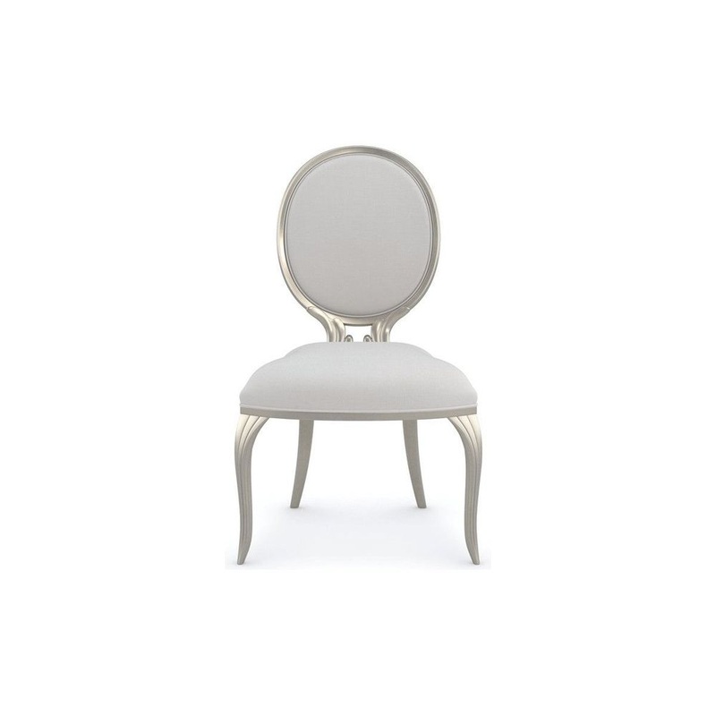 Forever-fashionable with an oval-shaped back, this side chair makes an elegant dining companion. Dressed to impress and ease entertaining, its plush seat and inside back are tailored in a shimmering performance hobnail satin. Features fluted front legs and back legs with a scroll detail for added embellishment.