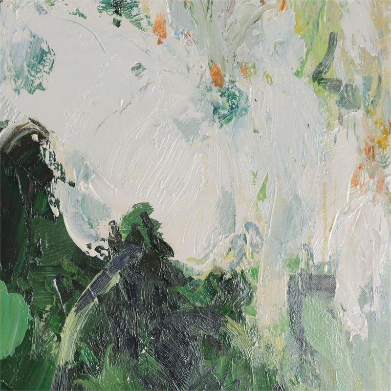 Composed Grace Life by artist Shi Fei is a stunning oil painting on canvas, displaying an arrangement of flowers sitting within a glass jar. Sophisticated brushwork in elegant shades of white, yellow, and green give the piece a dream-like appearance. The artwork is displayed from a pinewood gallery frame and may only hang in a vertical orientation.