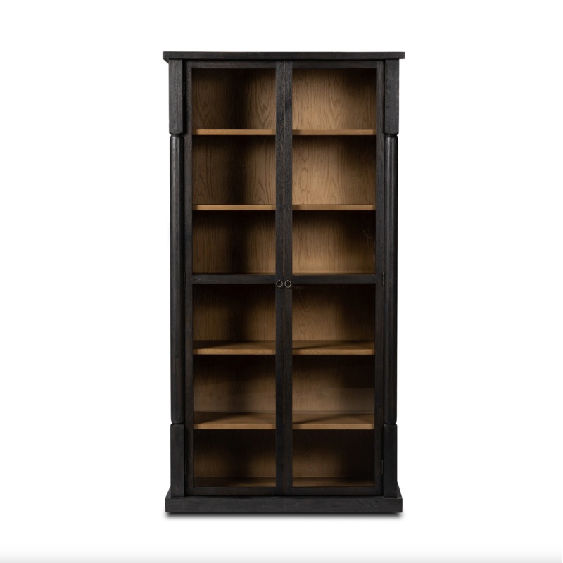 Made from oak veneer with a deep charcoal finish, this spacious cabinet delivers ultimate storage, including six shelves. Partially turned detailing on the front posts adds a design-forward finishing touch.