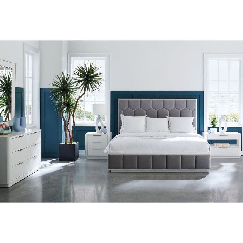 Rounded edges soften this clean-lined bedside table, quietly captivating in a Cloud White finish. Carved drawer fronts add tactile appeal with a woven mini-tile motif, accentuated by finger-cup pulls in Satin Nickel. Features two drawers and open center storage with a built-in light. A USB port and cutouts in the back let you charge devices and keep cords out of sight.