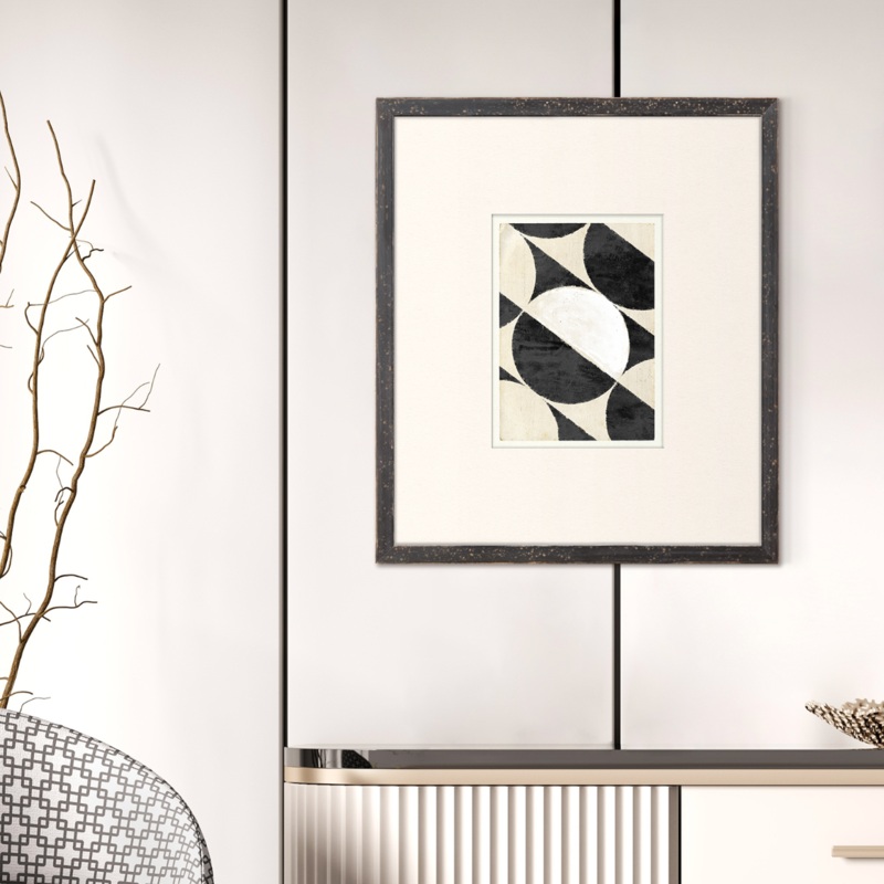Experience the sophistication and exclusivity of Contours VII. Each black and white geometric pattern is crafted on aged paper, evoking mid-century graphics. Framed with a wide matte and antiqued black profile, these pieces exude a collector’s vibe. Create your own gallery style hanging with these versatile and tasteful designs.