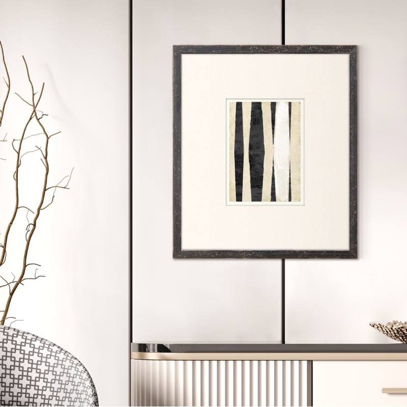 Experience the sophistication and exclusivity of Contours XI. Each black and white geometric pattern is crafted on aged paper, evoking mid-century graphics. Framed with a wide matte and antiqued black profile, these pieces exude a collector’s vibe. Create your own gallery style hanging with these versatile and tasteful designs.