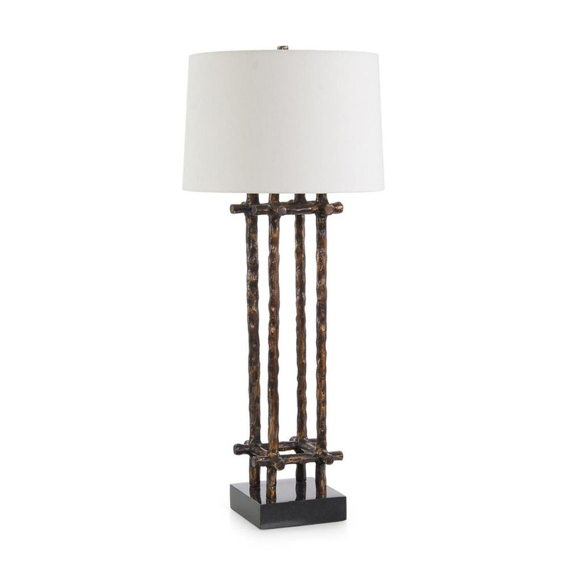 The Poteau Table Lamp features a slender, minimalistic design that is enveloped by a wealth of rigid texture. Four slender poles of hammered aluminum in a Copperd finish stretch upwards and are kept in place by smaller, horizontal rods at the neck and base to form the body of this gorgeous turnkey lamp. The piece is supported by a squared base of black granite and accented with a bronze finial to match the body.