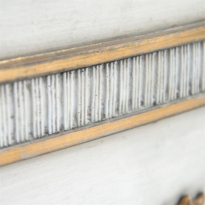 This two-drawer nightstand in the French country style features push-to-open drawers. Set on gently tapering legs, it features a carved, reeded frame around the drawer fronts and on the leg posts. The case is finished in a distressed cream with gold detailing.