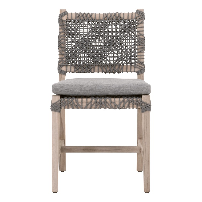 These woven dining chairs will add a touch of coastal style to your outdoor or indoor living space. Constructed with a solid teak frame and legs, these chairs are not only sturdy, but durable and built for the outdoors. A rich dark gray rope is tightly woven to create a uniquely designed seat with a nautical look. The legs are built with leg stretchers for extra support and feature a beautiful gray finish. A removable seat cushion is covered with a performance fabric and be easily cleaned. These side dining chairs will be the perfect addition to any transitional or traditional living or outdoor area.