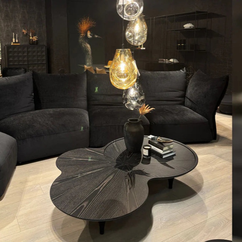 The coupe coffee table offers a striking blend of natural inspiration and modern design. Its unique tri-circular top is made from birch wood and has a sophisticated vintage black wash finish. Adding a touch of whimsy, the table’s icicle-inspired leg detail brings an unexpected element of the outdoors into your living space, making it a captivating centerpiece. Practical and spacious for styling.
