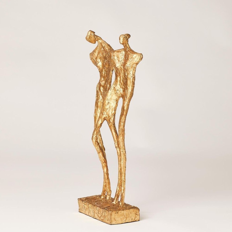 Description: Dramatic cast iron sculpture with a gold leaf finish of two interacting figures. We speculate their closeness leads them to be a couple in love.
