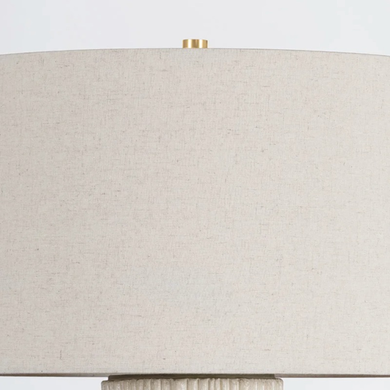 A classic mid-century modern column lamp receives a contemporary update in Crestwood. The allover fluting of the ceramic base adds a layer of dimension to the straightforward silhouette. A large linen drum shade imparts a fresh, airy feel, while an Aged Brass finial and stem provide refined warmth.