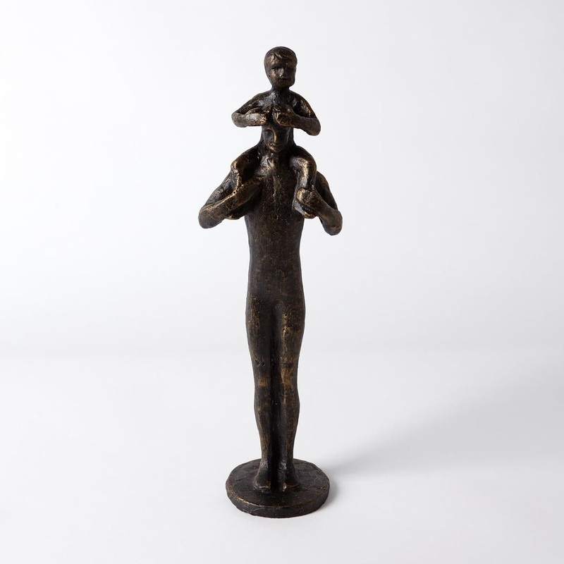 Description: A touching moment between a father and son is captured in this iron sculpture featuring a bronze finish.