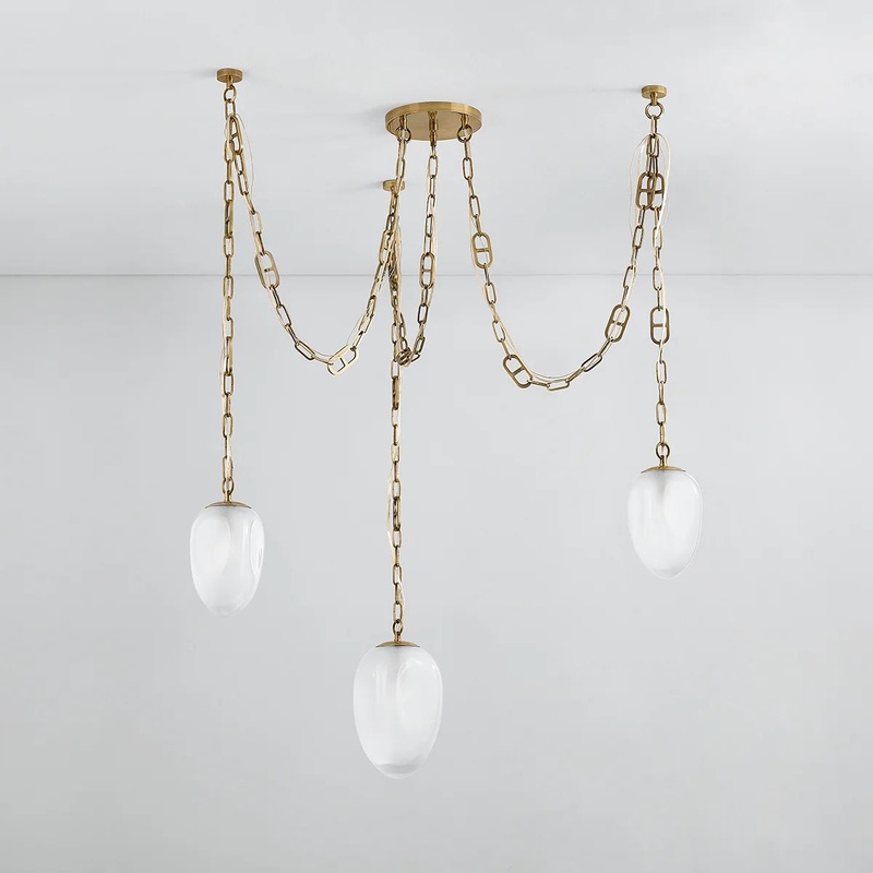 Taking inspiration from the sugarloaf gemstone cut, the elongated shades of Daith feature a softened pyramid structure. Made from super thick, clear, etched glass, they are suspended on Nozs signature mariner chain, which is finished in Vintage Brass. Available as either a 3 or 6-light chandelier or a single-light sconce. Part of our Noz Nozawa collection.
