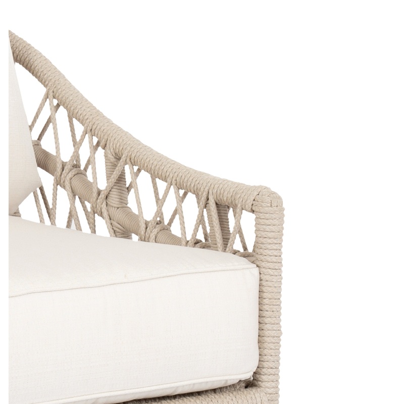 The Dana Rope Sofa is the perfect balance between intricate pattern combined with an organic, free flowing aluminum structure. This macram inspired frame features a curved back and sloped arm, expertly wrapped in premium all-weather olefin rope in natural Linen.