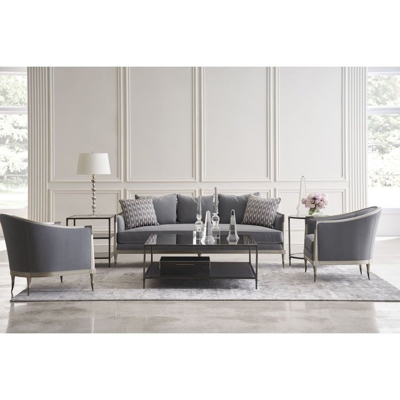 This sofa’s softly curved silhouette is tailored to perfection and outlined in illuminating Soft Silver Paint. Delicate metal ferrules and metal knuckles on the front arms draw their inspiration from an antique Italian parlor chair. Sumptuous pillows in coordinating tones add comfort and fashion to the overall design of this irresistible sofa.
