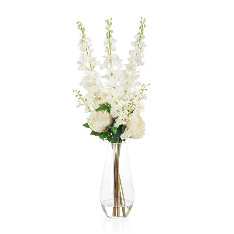 Delphinium Bloomsis a stylish floral arrangement that showcases white garden delphiniums and peonies within a clear glass vase with faux water.