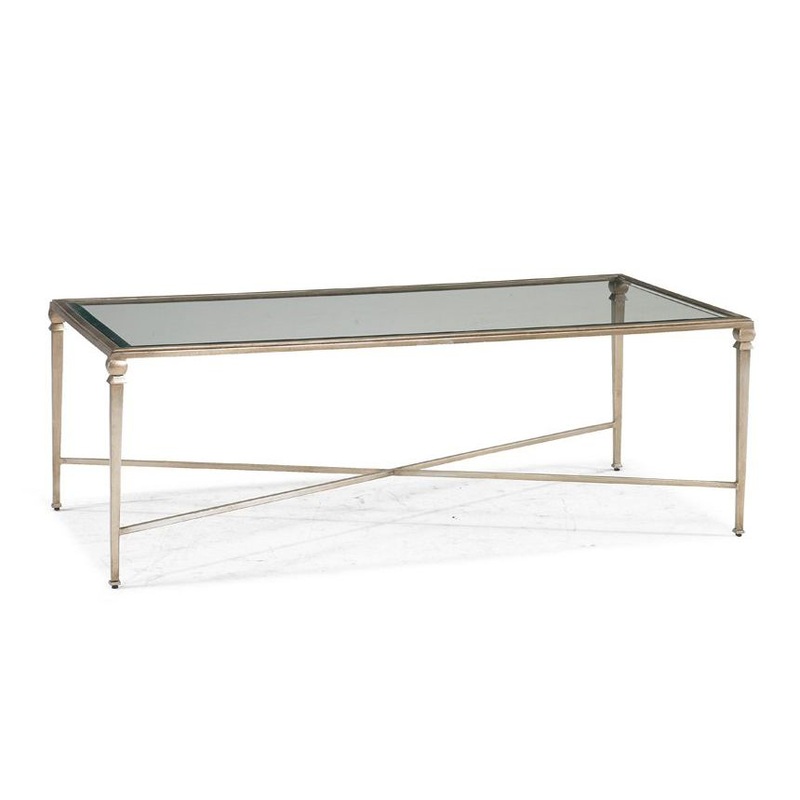 Simplicity of design with classic traditional elements best describe this sleek rectangular cocktail table. All welded metal frame in a handsome silver leaf finish with an X-stretcher and an inset clear beveled glass top.