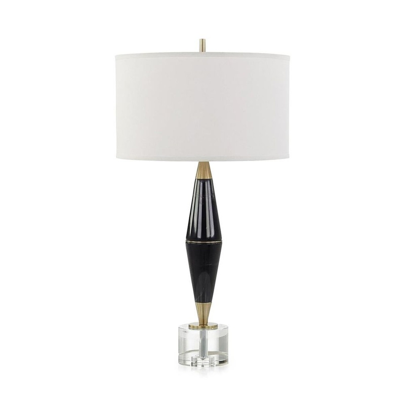 The Heinrich Lamp combines simple, elegant shapes with stunning natural materials. Crafted from black marble, the piece takes the shape of a tapered cone with accents of Brushed Brass along the base and neck. This table lamp with a three-way switch sits atop a round base of clear crystal. Steel hardware in a Brass finish and a cylindrical finial complete the look,