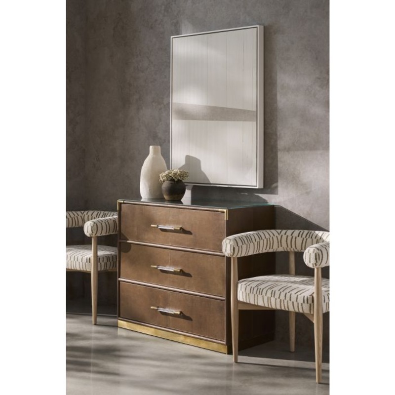Leather wrapped with Aged Gold metal plinth base. Acrylic drawer pulls with gold metal accents. Features three drawers. Ships with 1/4″ lay-on glass top.