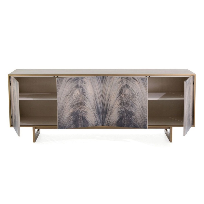 Description: Veneered in ash and finished in antique beluga, the front of this impressive credenza features individual prints of an exotic crotch veneer. Glazing is applied by hand before a final clear lacquer. The case is set on a steel base in a brushed brass finish, with a front molding to match.