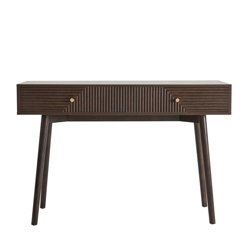 Featuring a stunning geo-textured design and sleek gold metal handles, this console table brings a touch of sophistication to your bedroom or dressing space.