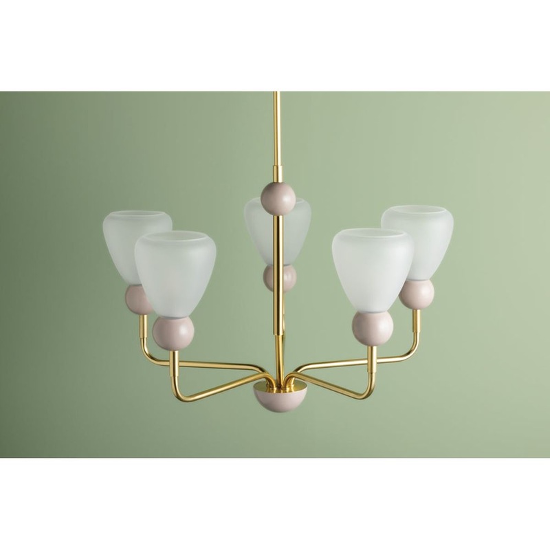 Description: Treading the line between art and design, Doreen combines sleek Aged Brass metalwork with whimsical details. Conical shades cast from etched matte glass diffuse light over a large area while serving as a focal point. Painted peignoir ball details lend a playful charm to this enchanting wall sconce and chandelier.