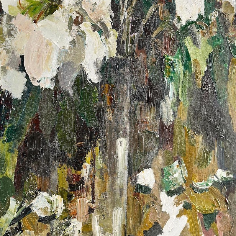 Dreamlight Elegant by artist Gu Feng is a stunning oil painting on canvas, displaying an arrangement of flowers sitting within an elegant vase. Sophisticated brushwork in radiant shades of white, yellow, and green give the piece a dream-like appearance. The artwork is displayed from a gorgeous white gallery frame and may only hang in a vertical orientation.
