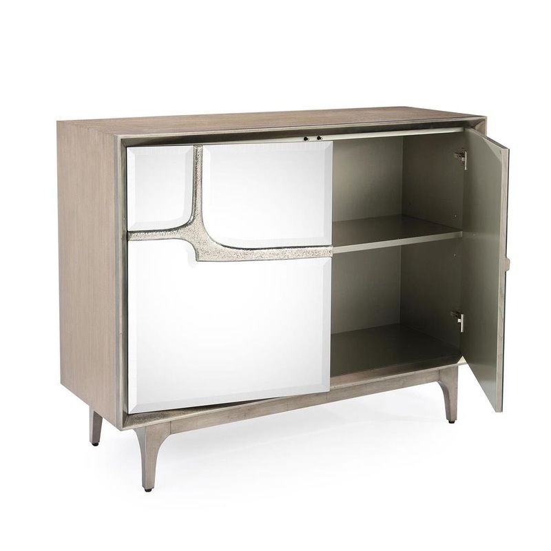 Driftwood Mirage Cabinet is a sleek design statement that exudes contemporary charm. The square frame is crafted from beech, ash, and celtis woods and shown in a Driftwood finish, showcasing stylish neutral tones. Two cabinet doors are affixed with beveled mirrors overlain with an angular motif in Antique Pewter, contributing a wealth of textural depth. Accent trim along the front edges and a base with four legs, also in Antique Pewter, complete the look. This gorgeous cabinet features a single interior compartment with an adjustable shelf.