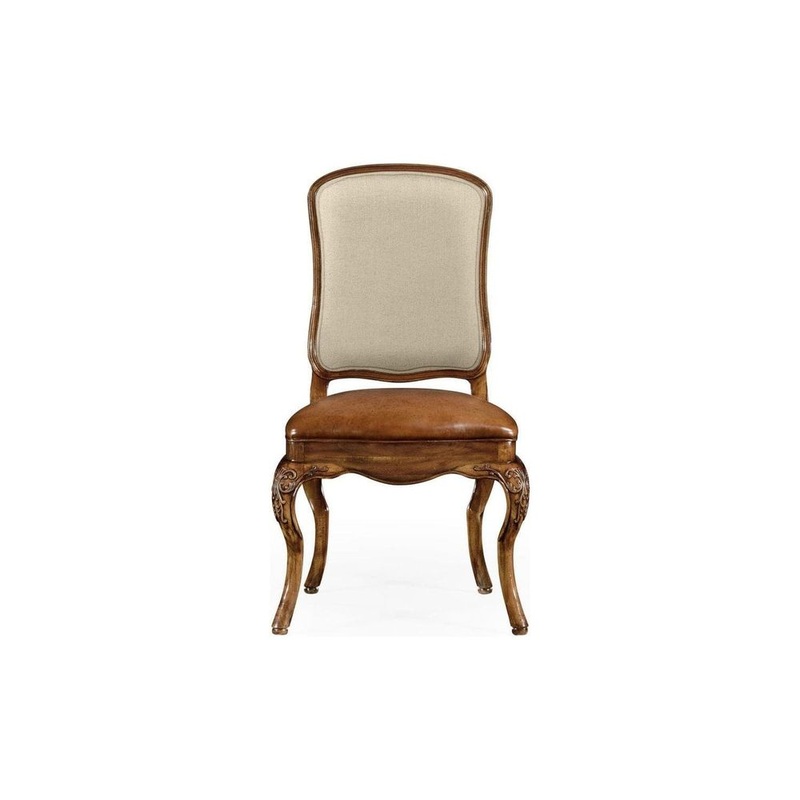 Walnut Louis XV style side chair with curved back and seat above bracketed tapered cabriole legs with scrolled feet. Fine carving to tops of legs. A DV medium antique chestnut leather seat and fabric upholstered back panel. (Shown with Mazo fabric.). Armchair: 499180.