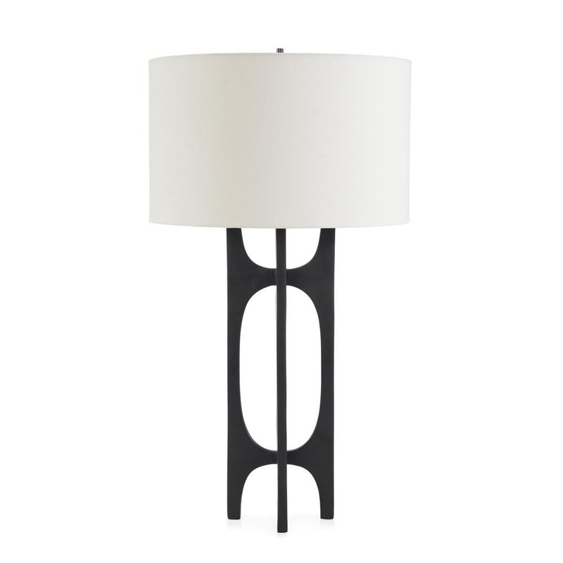 The Ebony Collegare Table Lamp showcases playful juxtaposition between clean lines and seductive curvature. Expertly crafted from metal, the body of this turnkey lamp displays a gorgeous matte black finish, as well as a masterful use of negative space that imbues an interior space with pristine, contemporary flair. A black cylindrical finial perches atop a brass harp in a polished finish that introduces subtle metallic tones to an interior space.