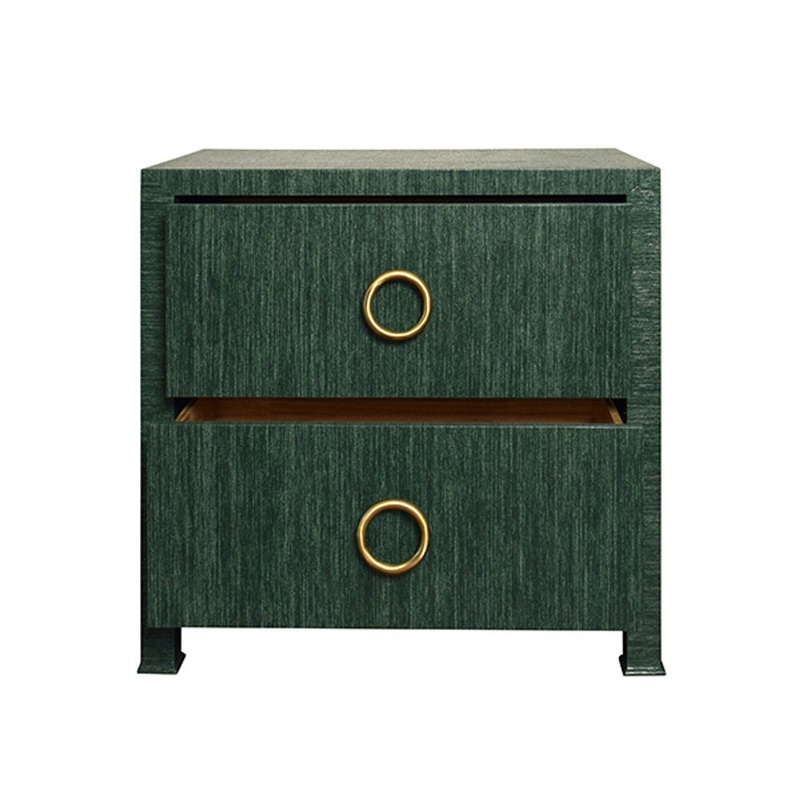 Description: TWO DRAWER SIDE TABLE WITH ANTIQUE BRASS CIRCLE HARDWARE IN DYED GREEN GRASSCLOTH