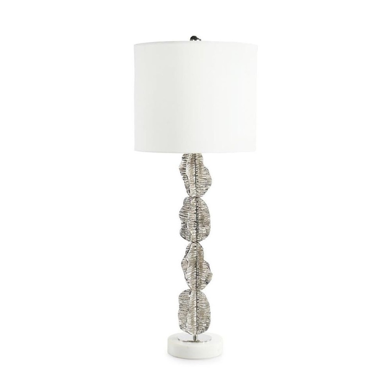 The Paradise Table Lamp combines gorgeous natural motifs with sleek, contemporary tones. Crafted from brass in a Nickel finish, four organic shapes with textural grooves create a towering stack. The piece rests atop a circular base of white marble, contributing pristine white tones to the metallic piece.