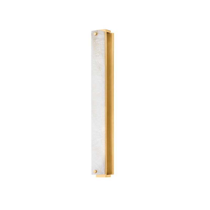 A modern air lantern design with a bold architectural silhouette. In lieu of a central light source, LED strips are integrated into the cage of Edgemere itself. A rectangular panel of alabaster is attached to each arm, creating a geometric array of light within the piece. The sleek mixed materiality feels grand and traditional with a futuristic edge. Available in a 3 or 4-light pendant in Aged Brass or Aged Brass and Distressed Bronze or a single light sconce in Aged Brass or Distressed Bronze.