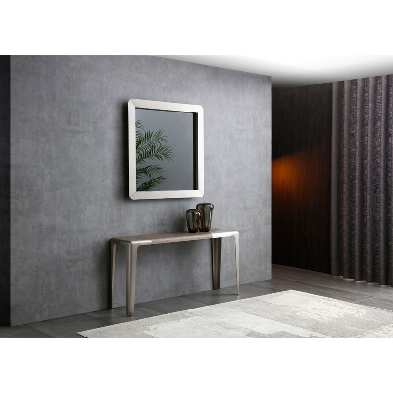 Elevate your space with our stunning Elena square mirror, featuring four sides of sleek stainless steel with a brushed nickel finish and a tawny mirror center. Perfect for adding a touch of modern sophistication to any room.