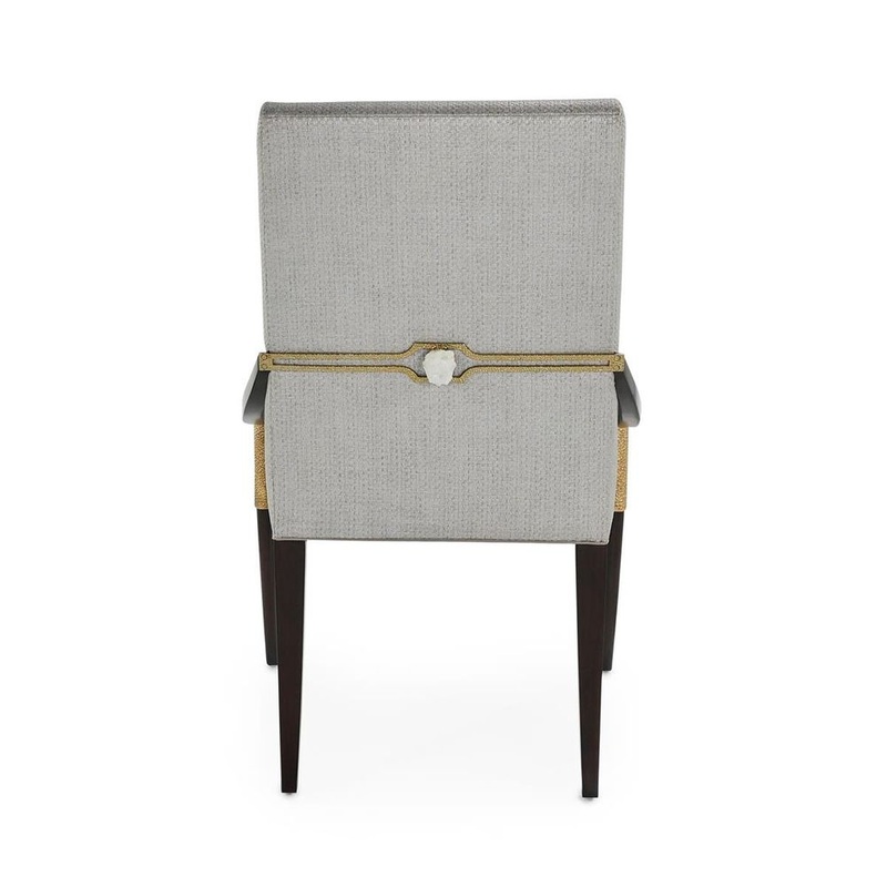TheElisa Armchair is a sophisticated seating solution that features a contemporary frame of curved beech wood in Espresso, upholstered in Precious Metal Pewter 3056 fabric with small welt trim in Noble String 2158. The outside back has a jewelry-inspired Polished Brass accent affixed with a white quartz stone in the center, beautifully complemented by bands of hand-carved metal bands adorned in gold leaf.