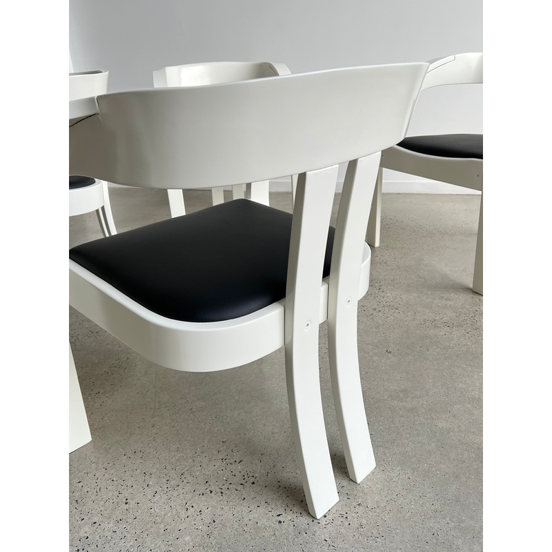 This set of five Elisa dining chairs was designed by Giovanni Battista Bassi for Poltronova in 1964. Defined by their geometric modernist lines and crisp black-and-white contrast, the chairs exemplify the clean, functional elegance of Italian mid-century design. Their distinctive curved backs and lacquered finish highlight Bassis refined architectural approach to furniture.