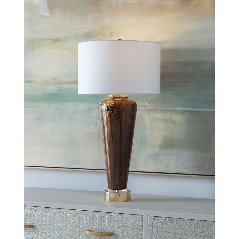 Description: This handsome table lamp with a brown enamel has a little something extra to add to its opulence. It is dressed with a contemporary tassel accented with beautiful golden jasper, green onyx, and prehnite.