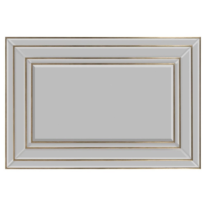Description: Individual panes of clear bevelled mirror, with a floating frame around the main central mirror which is also bevelled. The exposed frame finished in antique brass leaf.
